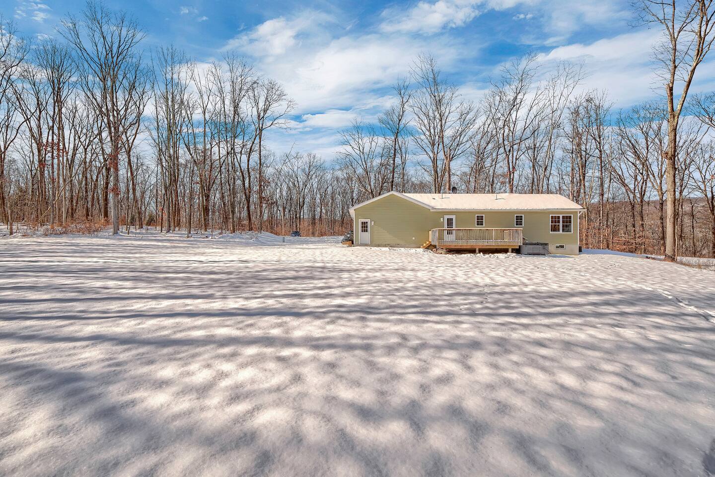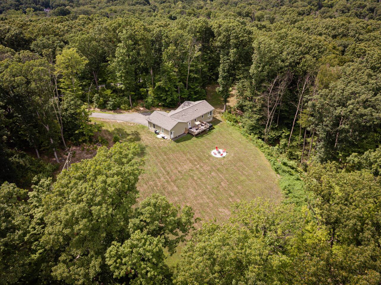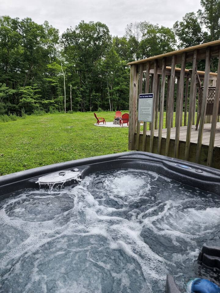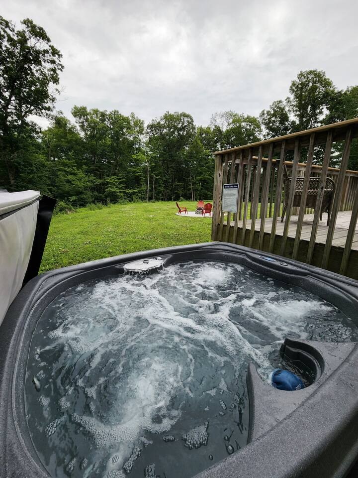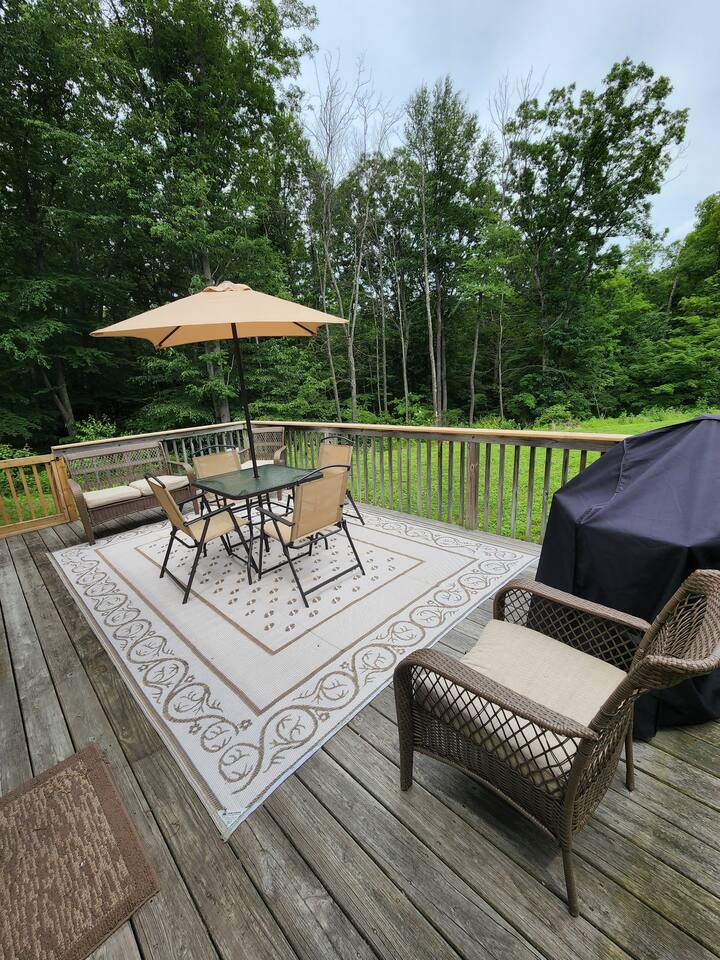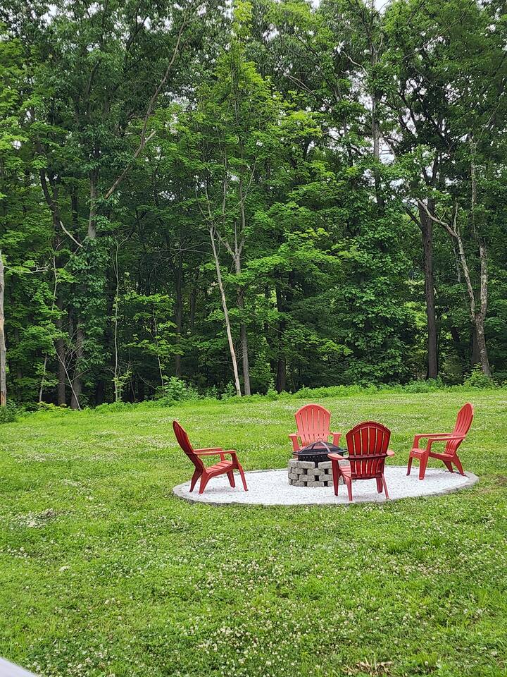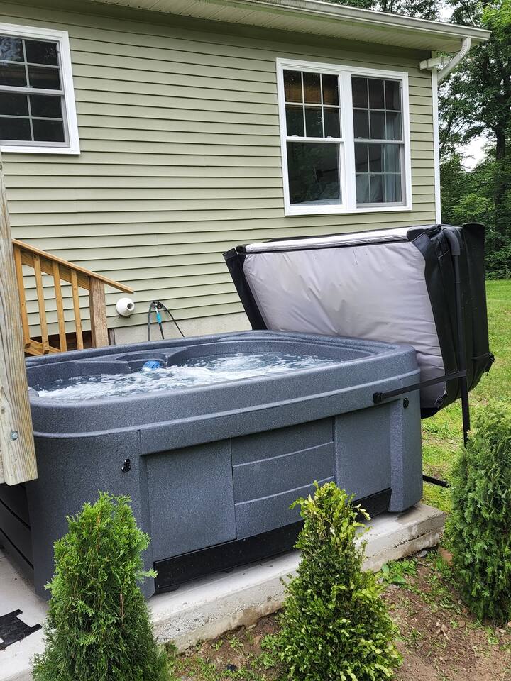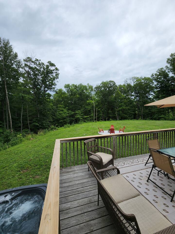 •This home is a nature-lover’s delight. Nestled on a peaceful, serene and private 5-acre property in the mountains of the Lower Hudson Valley, it is where Upstate and Downstate intersect, with the best of both worlds at your fingertip. •Our wonderful home boasts 3 inviting bedrooms - including a master bedroom with a king-sized bed — sleeping a total of 6 people, making it perfect for that long planned trip of family and friends. Each room boasts a smart TV, with the living room area boasting a large screen for joint viewing. •Beautifully remodeled (2021) in a welcoming farmhouse style — both in layout and related decor — this home and surrounding property invite you to get away without getting too far away. The spacious property is surrounded by greenery in the summer and white snow in the winter, with neighbors far out of sight and out of mind. •The private acreage outdoors has a large deck to accommodate all, with an all-season outdoor hot tub and jacuzzi. Summertime, it serves as the place to spend your vacation in nature’s warm embrace. •The property is a one-hour-drive from NYC; less than ten miles from the new Legoland New York resort; in the vicinity of the popular Woodbury Commons mall; minutes from Mt. Peter Ski Area; near Sterling Forest State park, with the famed Appalachian Trail passing right nearby; with many more recreation and dining options nearby.