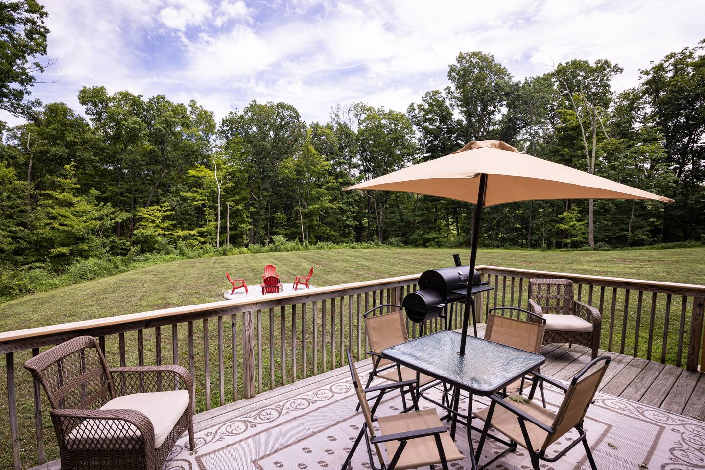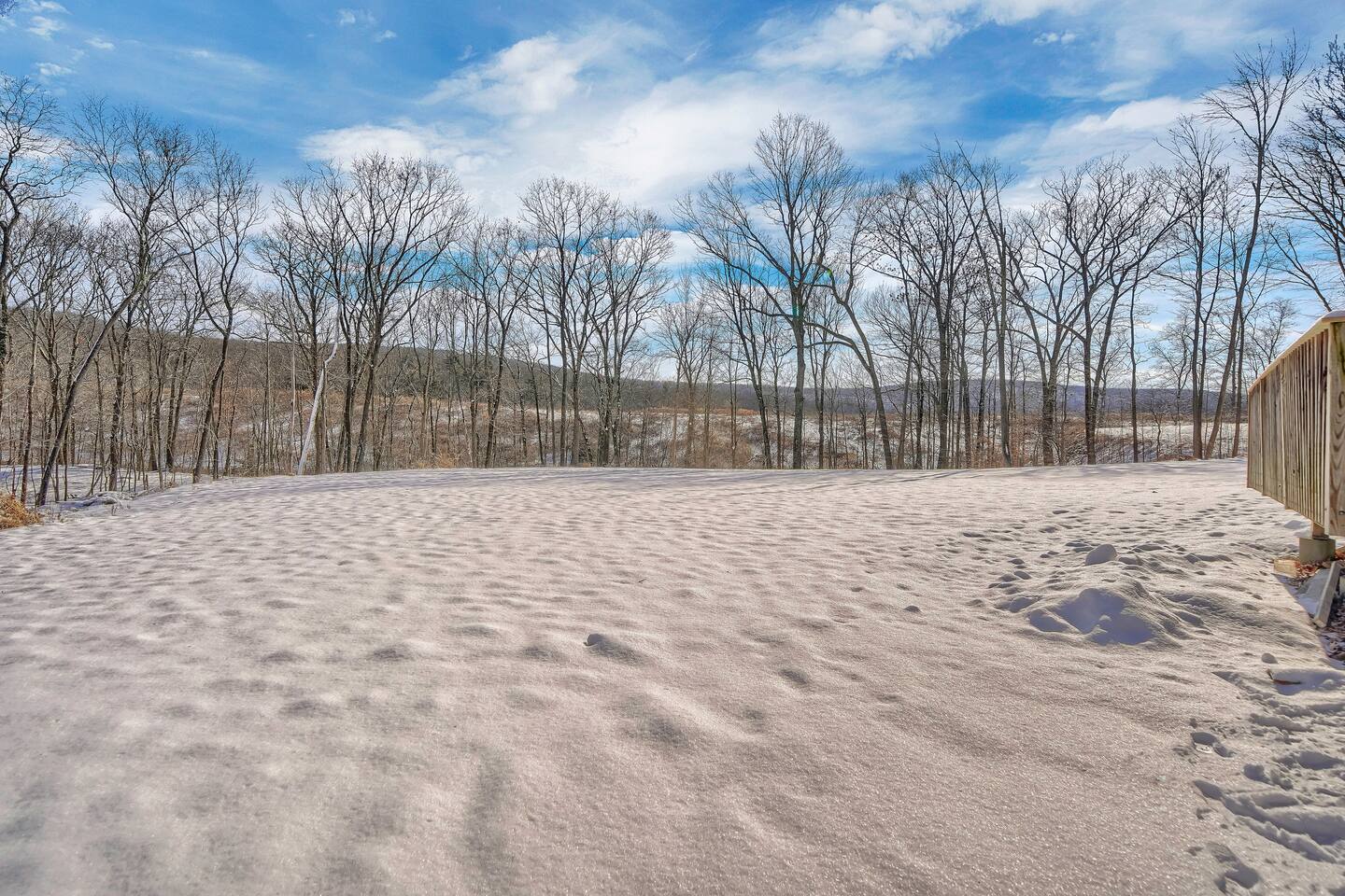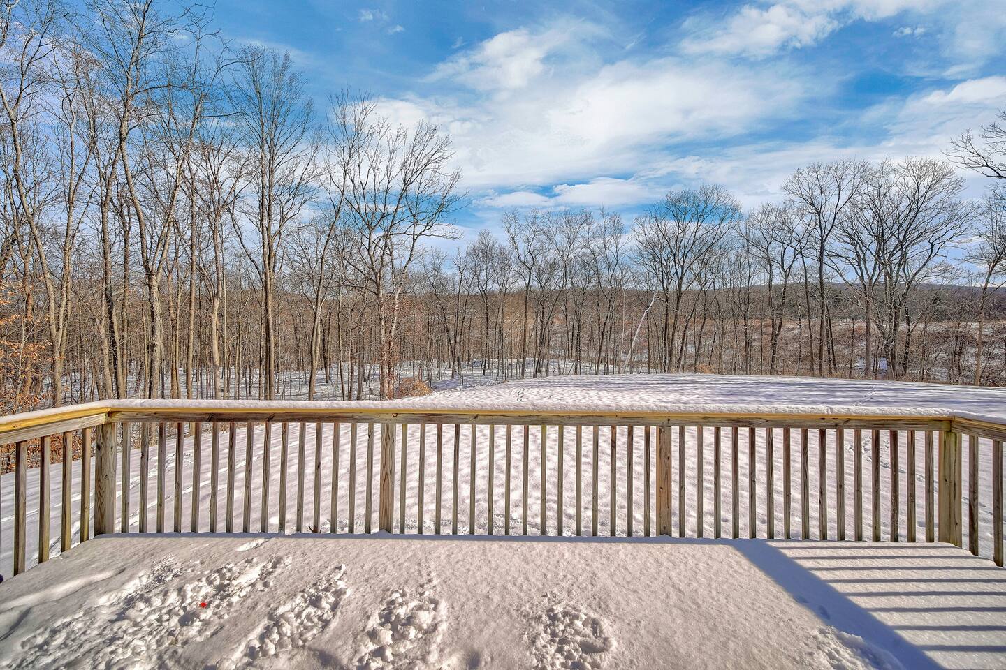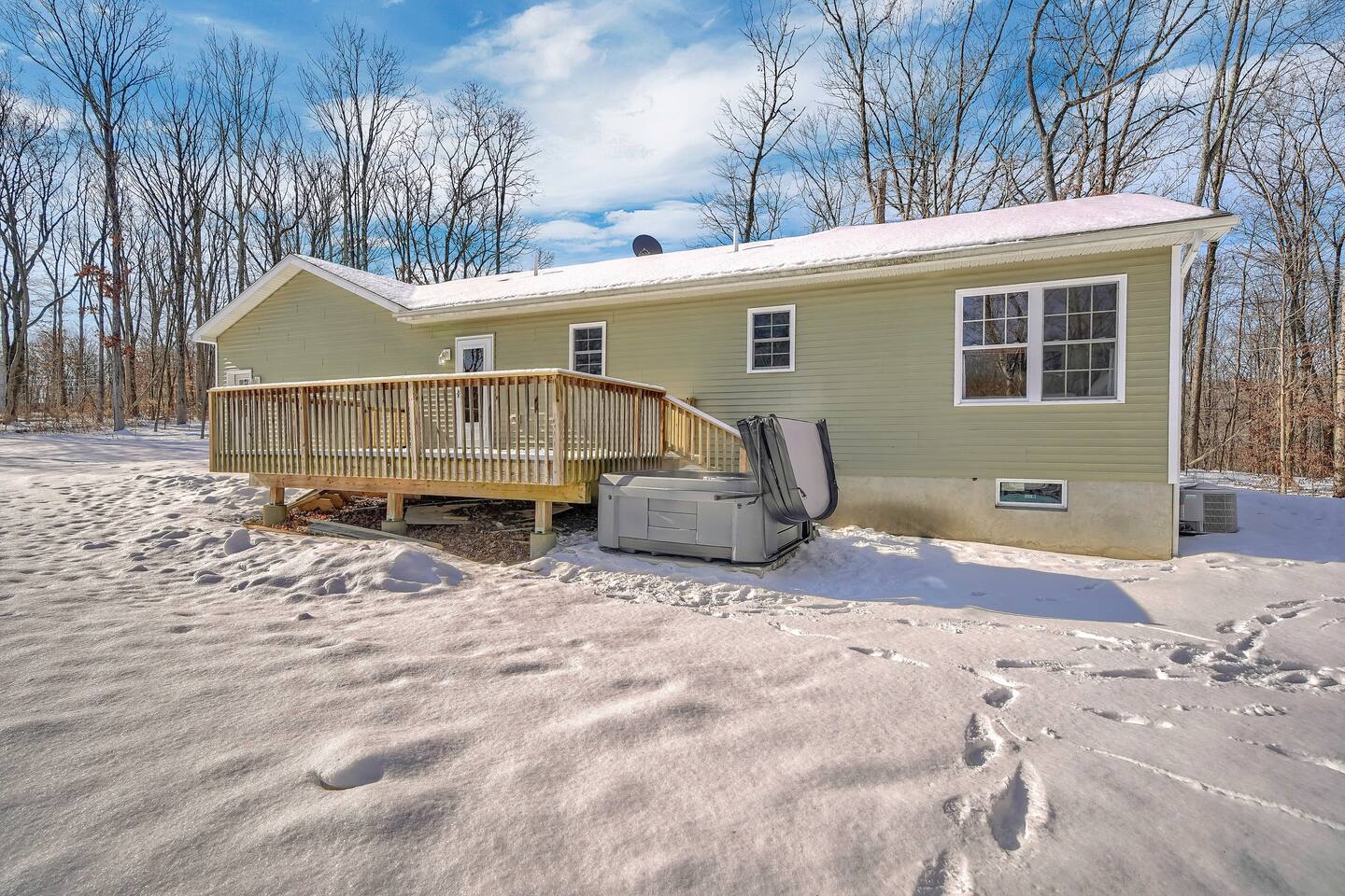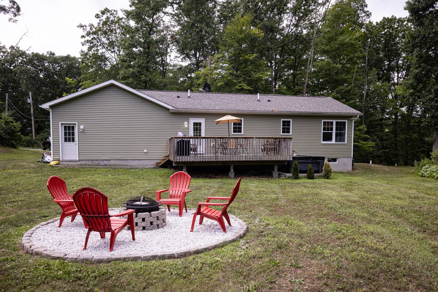 •This home is a nature-lover’s delight. Nestled on a peaceful, serene and private 5-acre property in the mountains of the Lower Hudson Valley, it is where Upstate and Downstate intersect, with the best of both worlds at your fingertip. •Our wonderful home boasts 3 inviting bedrooms - including a master bedroom with a king-sized bed — sleeping a total of 6 people, making it perfect for that long planned trip of family and friends. Each room boasts a smart TV, with the living room area boasting a large screen for joint viewing. •Beautifully remodeled (2021) in a welcoming farmhouse style — both in layout and related decor — this home and surrounding property invite you to get away without getting too far away. The spacious property is surrounded by greenery in the summer and white snow in the winter, with neighbors far out of sight and out of mind. •The private acreage outdoors has a large deck to accommodate all, with an all-season outdoor hot tub and jacuzzi. Summertime, it serves as the place to spend your vacation in nature’s warm embrace. •The property is a one-hour-drive from NYC; less than ten miles from the new Legoland New York resort; in the vicinity of the popular Woodbury Commons mall; minutes from Mt. Peter Ski Area; near Sterling Forest State park, with the famed Appalachian Trail passing right nearby; with many more recreation and dining options nearby.